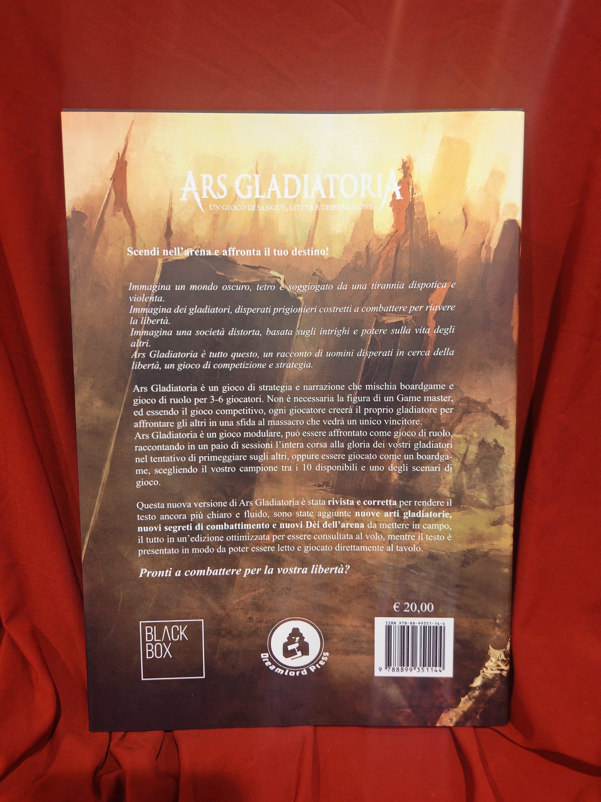 Ars Gladiatoria è un gioco di strategia e narrazione che mischia boardgame e gioco di ruolo per 3-6 giocatori. Non è necessaria la figura di un Game master, ed essendo il gioco competitivo, ogni giocatore creerà il proprio gladiatore per affrontare gli altri in una sfida al massacro che vedrà un unico vincitore. Ars Gladiatoria è un gioco modulare, può essere affrontato come gioco di ruolo, raccontando in un paio di sessioni l’intera corsa alla gloria dei vostri gladiatori nel tentativo di primeggiare sugli altri, oppure essere giocato come un boardgame, scegliendo il vostro campione tra i 10 disponibili e uno degli scenari di gioco. Questa nuova versione di Ars Gladiatoria è stata rivista e corretta per rendere il testo ancora più chiaro e fluido, sono state aggiunte nuove arti gladiatorie, nuovi segreti di combattimento e nuovi Dèi dell’arena da mettere in campo, il tutto in un’edizione ottimizzata per essere consultata al volo, mentre il testo è presentato in modo da poter essere letto e giocato direttamente al tavolo. Pronti a combattere per la vostra libertà?