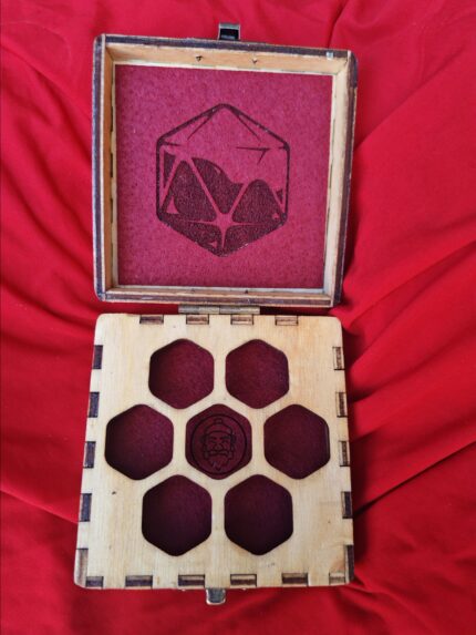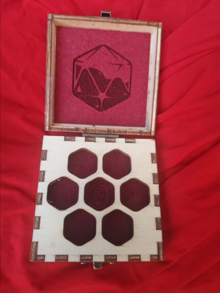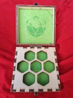 cofanetto per un set di dadi, disegno laser e tessuto interno.