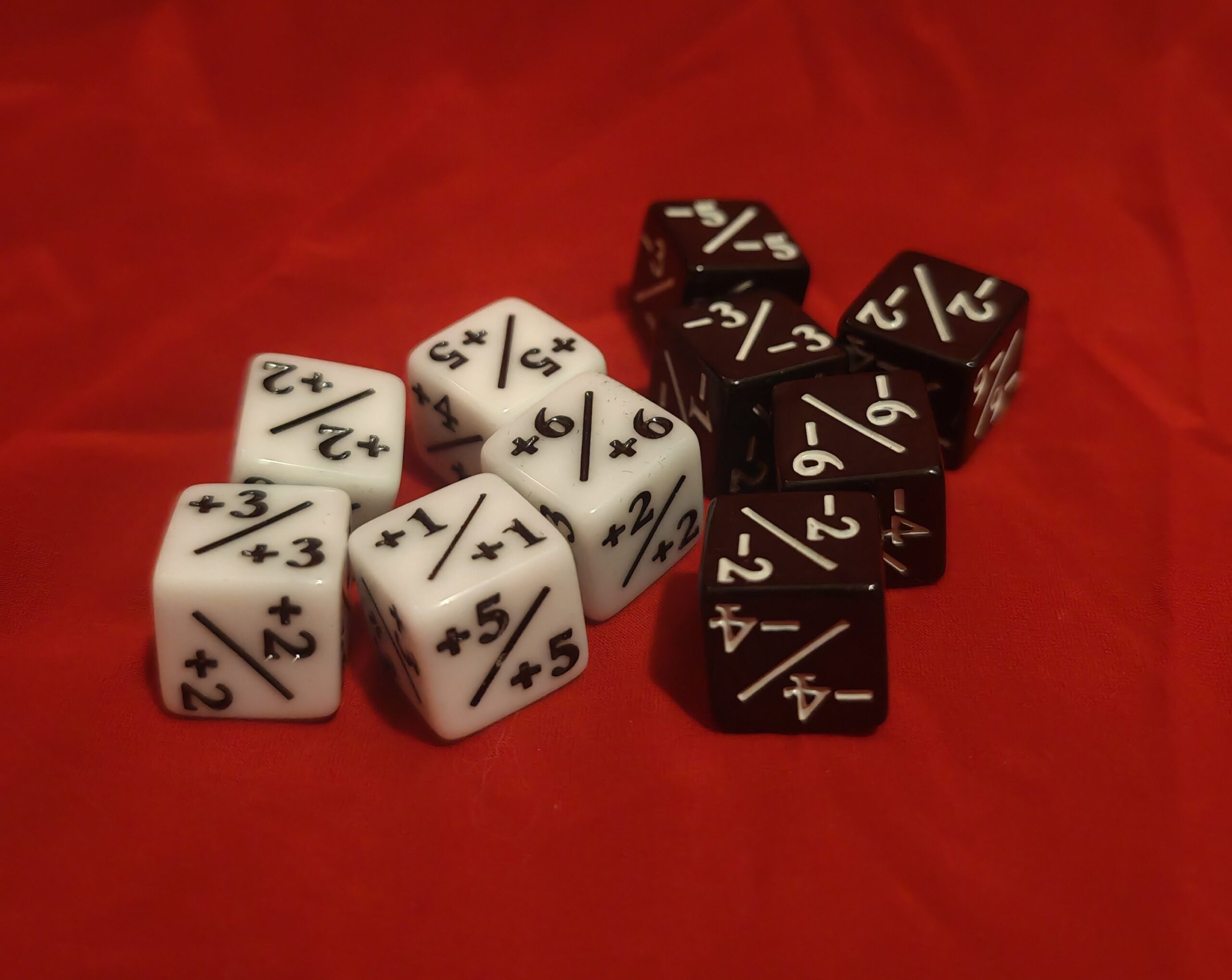 dadi a 6 facce per segnare potenziamenti e danni negativi per le creature in magic the gathering.