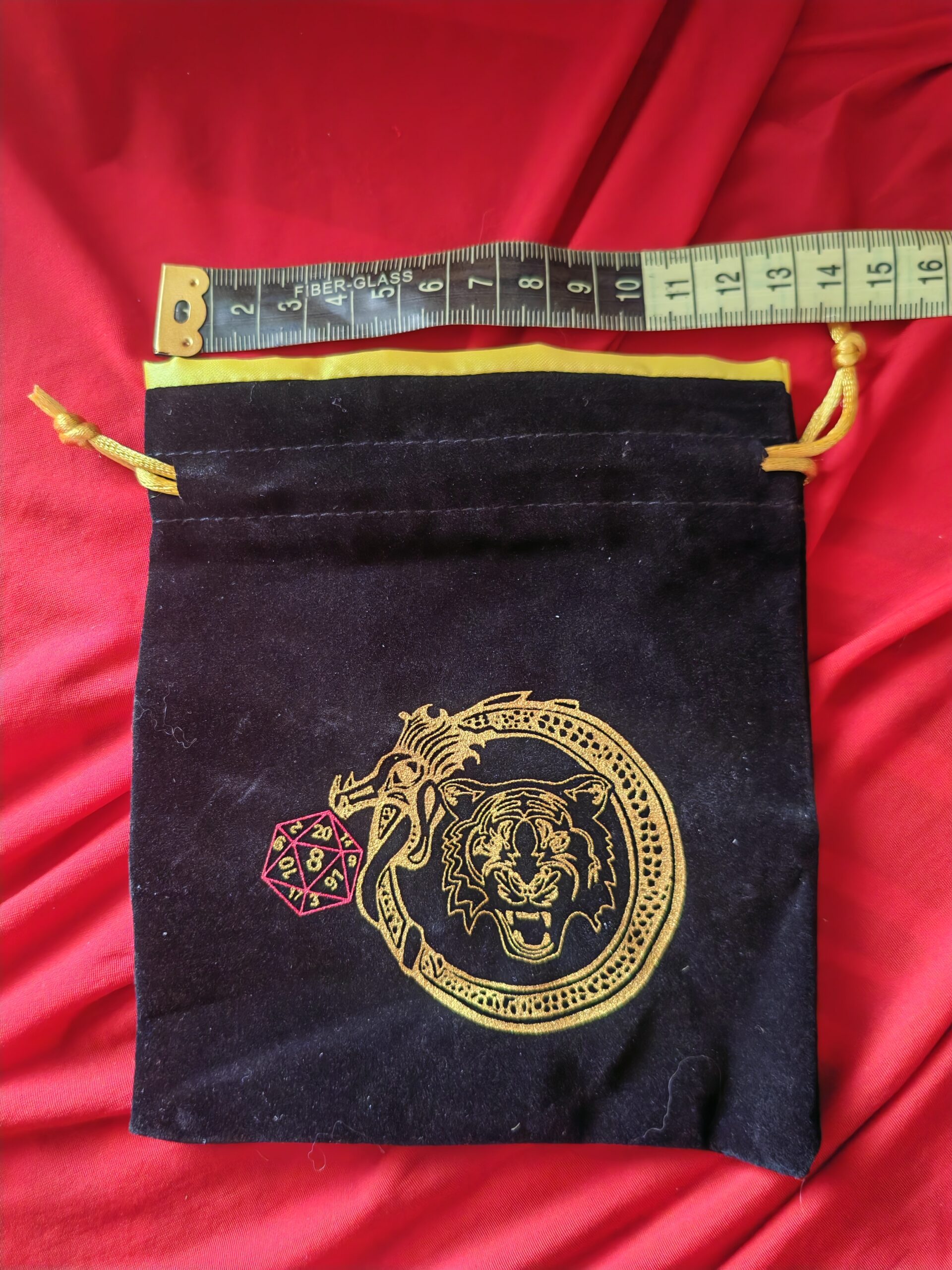 Sacchetto portadadi nero/oro 13×15.5 centimetri disegno drago/tigre/d20 NUOVO