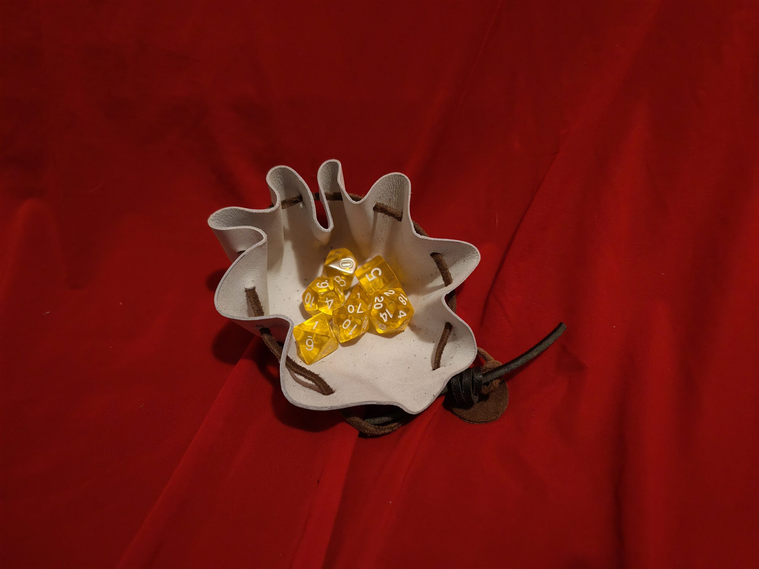 In pelle, lavorata a mano, dimensioni esterno da chiusa 7×6 centimetri circa, può contenere 2 set di dadi (DADI NON INCLUSI)