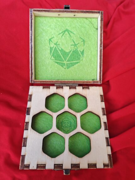porta dadi in legno, dimensione 85x85x35 millimetri cofanetto per un set di dadi, disegno laser e tessuto interno. produzione artigianale