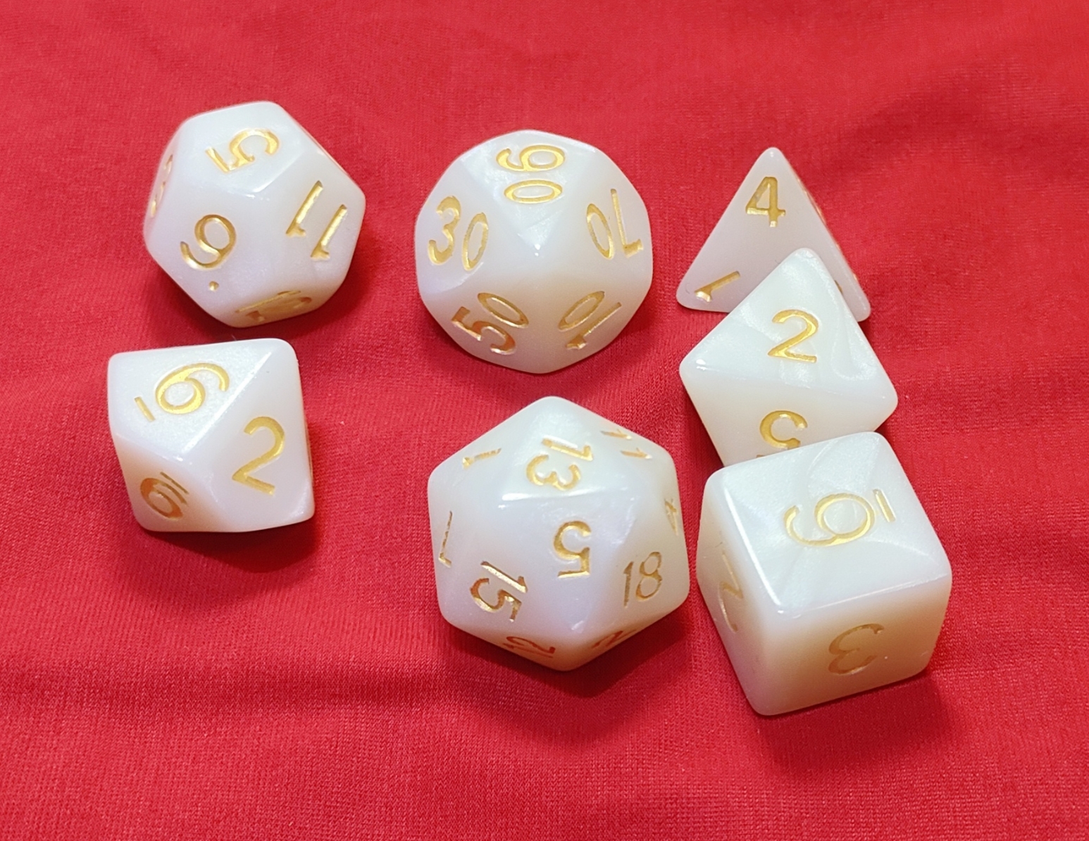 Set Dadi colore Bianco Perlato numeri Oro 7 dadi (4-6-8-10-%-12-20 facce) dimensioni standard