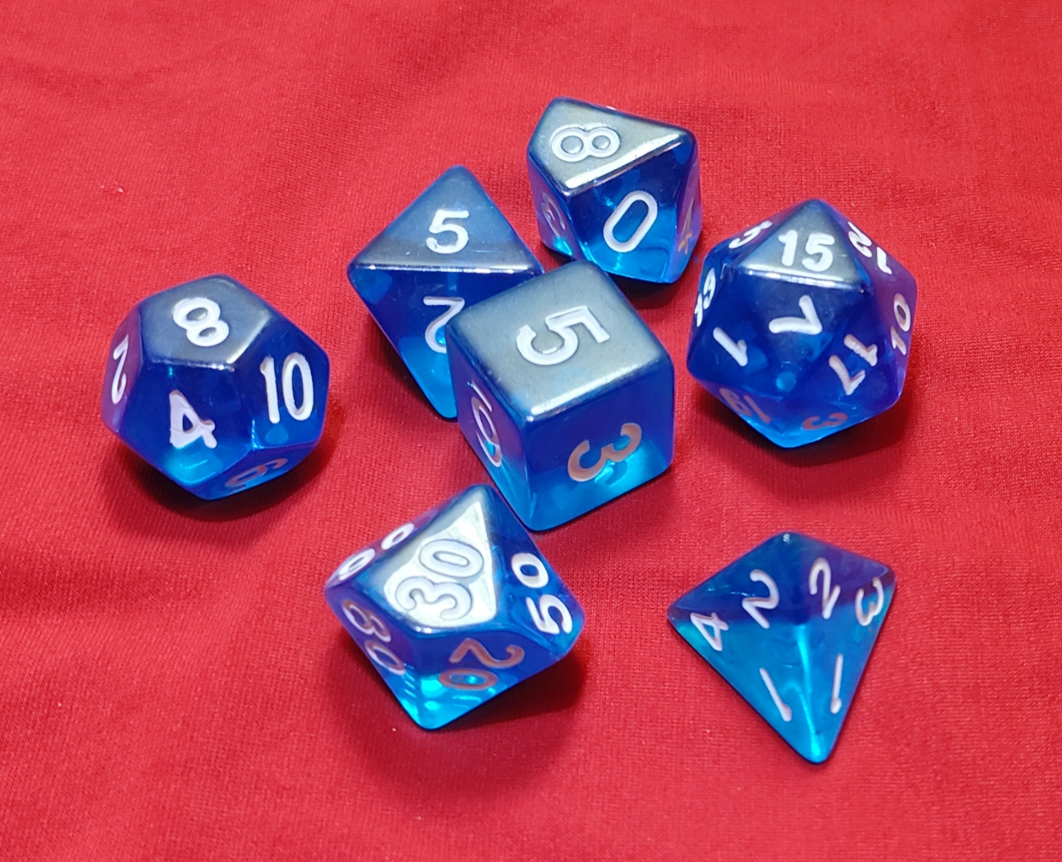 Set Dadi colore Blu trasparente numeri Bianchi 7 dadi (4-6-8-10-%-12-20 facce) dimensioni standard